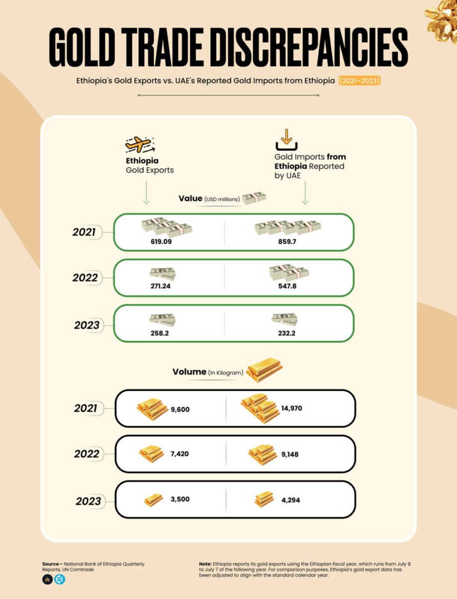 But this trade data also shows more than official exports. A comparison of gold exports reported by Ethiopia with gold imports declared by the U.A.E. reveals significant discrepancies.