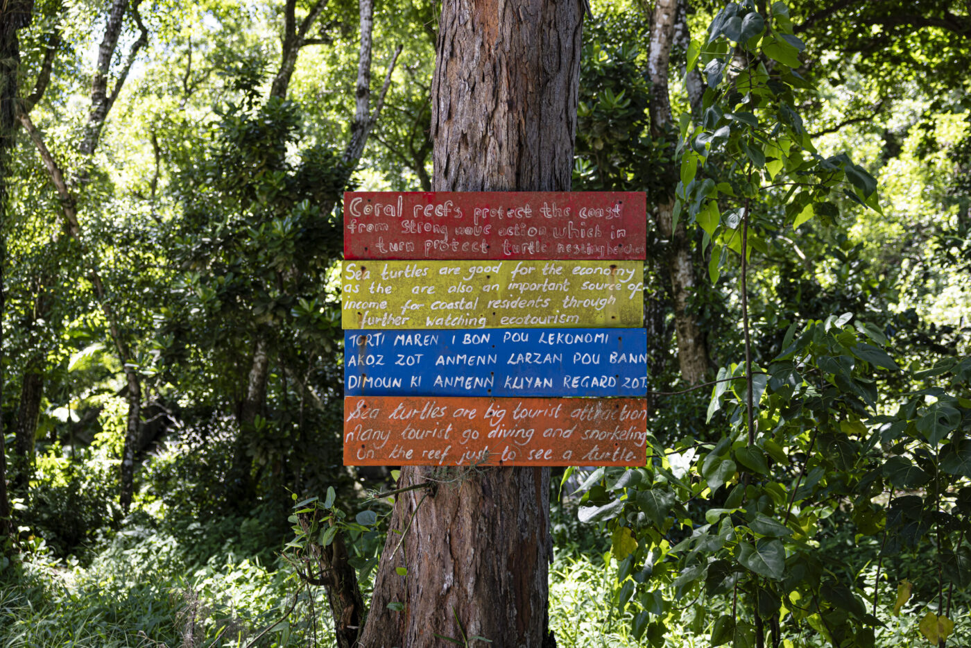In April 2024, the foundation of the original wall was still clearly visible, and smashed rocks and concrete littered the area next to the sign that warned visitors from violating sea turtle protections. Several vendors had set up stalls in the small shady clearing next to the sign. A man rented out beach chairs. Virginia Hoareau stood next to him, selling tourist trinkets at her makeshift wooden stall. “I had my license for craft,” she said. “All was good.”